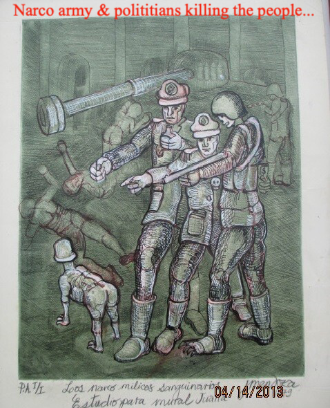 In the mural, I depicted the shocking event of November 1, 1979, in La Paz, Bolivia, known as All Saints' Day, which was altered by the “cocaine coup d'état.” I showed people emerging from the left side of Doña Juana's body, protesting against the military personnel on the right side of the Universidad Mayor de San Andrés. The armed military, flanked by an armored vehicle, attacked the crowd with dogs. I remember being bitten by one dog, and I had to jump from the atrium wall into the garden. The painting reflects the fear and violence of the narco-military regime, which caused suffering and more than 1,500 deaths. This was the first coup d'état involving drug trafficking in Bolivia, led by corrupt military officers like Alberto Natusch-Busch. Bolivian commanders allied themselves with drug traffickers like Roberto Suárez Gómez, leader of the Santa Cruz cartel, "La Corporación," which supplied cocaine to international criminal organizations. The military and the cartel tortured and murdered Bolivian leaders. This repression was part of Operation Condor (1975–1980), a campaign of political repression by far-right dictatorships in South America, which used intelligence, coups, and assassinations of leftists. Due to a search and arrest warrant for henchman and narco-paramilitaries, I had to travel to Mexico, leaving the mural unfinished.